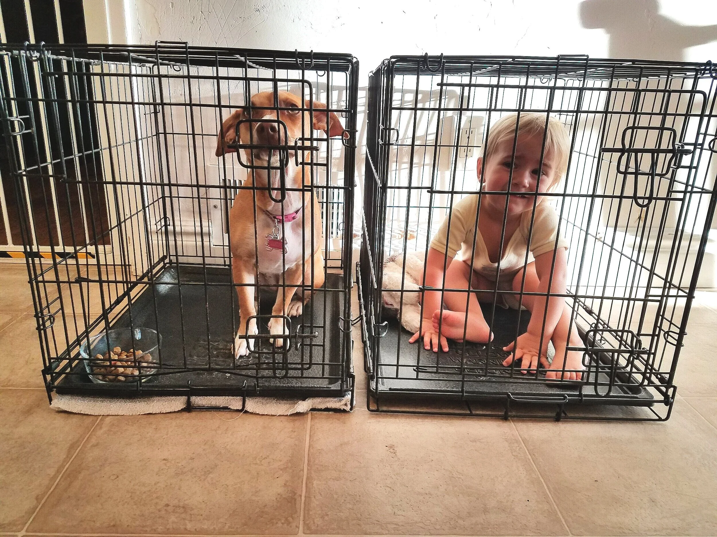 When unsupervised, your child should be confined to the nursery in a crib or pack n’ play. Your dog should be in a quiet room with a door inside his crate.